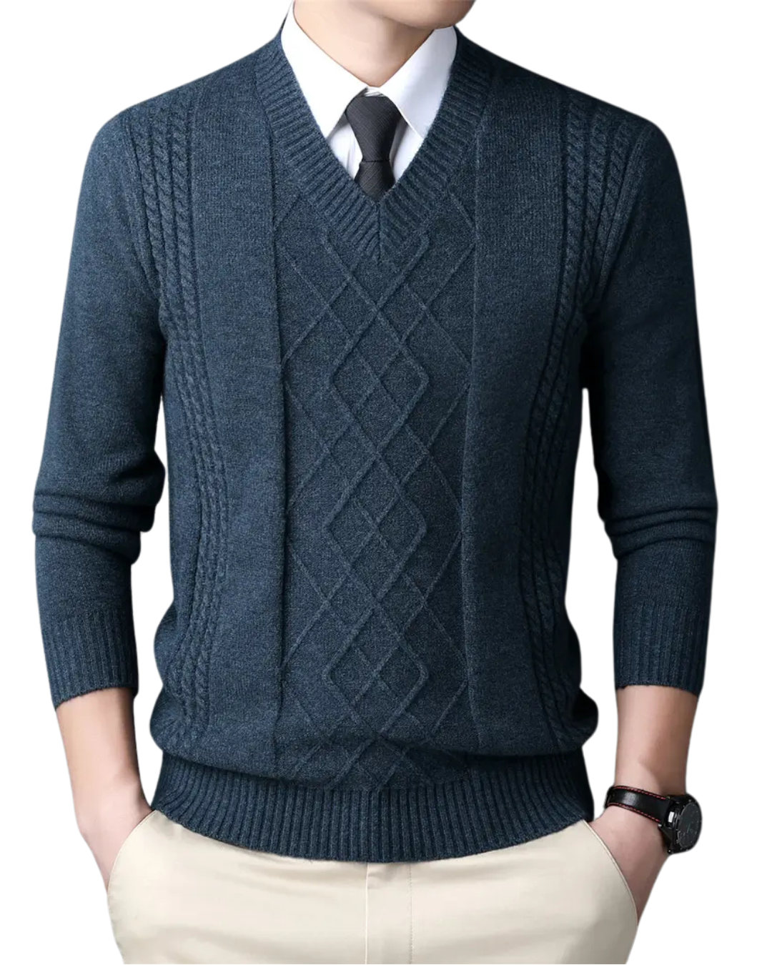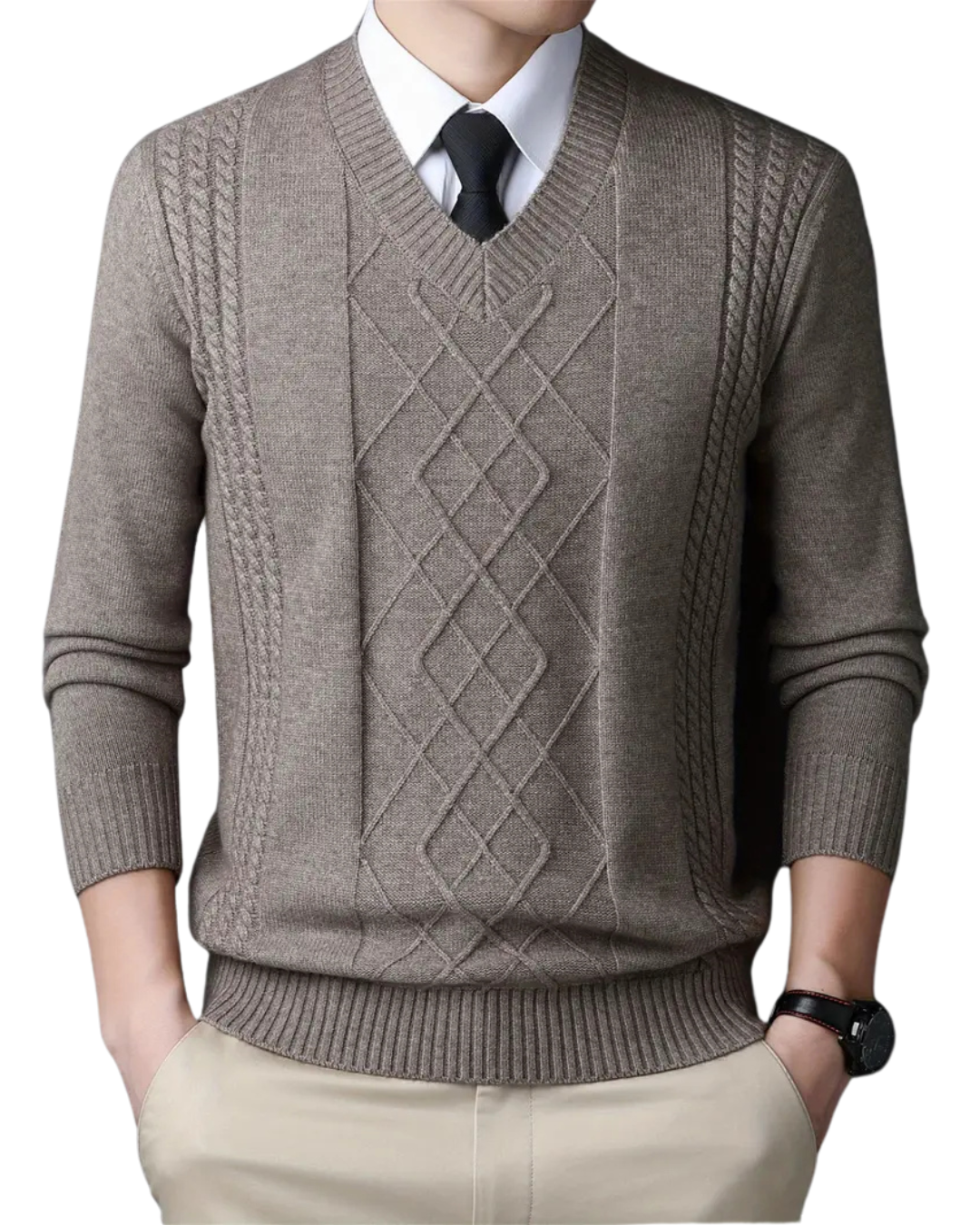 Elevate your professional wardrobe with the Avalon Heritage Sweater, where classic design meets contemporary elegance. This masterfully crafted sweater features an intricate diamond cable-knit pattern that speaks of heritage craftsmanship while maintaining a modern aesthetic. The sophisticated v-neck design and refined silhouette create a versatile piece that transitions effortlessly from boardroom meetings to evening occasions.